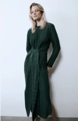 Vestido largo de Sfera en color verde botella. Presenta un diseño drapeado con nudo en la cintura y manga larga. - Tejido acanalado. - Corte midi. - Escote redondo. Da talla como una M