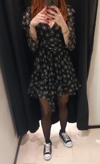 Vestido negro con un estampado floral en tonos rosas y verdes. Talla 50. (Aunque el maniquí sea más pequeño, es la talla indicada como puedes ver en las fotos.) De la marca Sfera. De corte amplio, es súper fresquito para verano. Con escote en pico y mangas avolantadas queda súper bonito tanto para ir a dar un paseo como para salir a cenar.