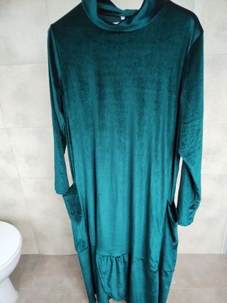 Vestido verde de terciopelo, largo con dos bolsillos. Sin estrenar por que no me sirve. Es más bien recto aunque tiene un volante abajo. Es elástico. Pone talla S, pero talla grande. Las medidas en la foto.