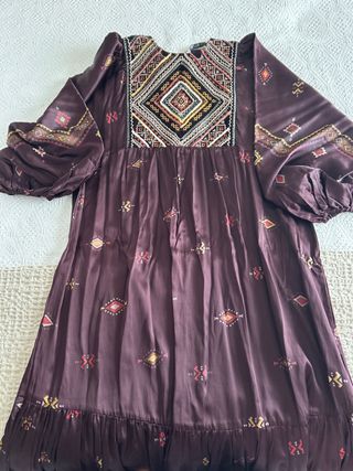 Vestido de Vila con un bonito bordado. Talla 40 pero talla grande - Diseño con escote en V. - Mangas 3/4 y acampanadas. - Detalle bordado en el escote y puños. - Falda con vuelo y caída en tela muy ligera