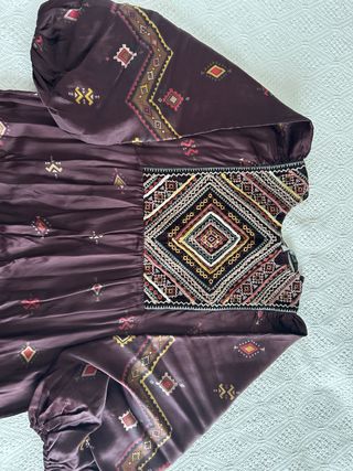 Precioso vestido con muchos detalles, de gasa estampada y totalmente forrado en punto negro, tirantes en los cuales tiene unas bolas de madera dorada y de plástico tipo cristal en turquesa de adorno, un pequeño escote pico con las mismas bolas de adorno, corte en la cintura con una tela sobre puesta haciendo como un cinturón y cae una gasa en picos, como la parte larga del cinturón, en la parte de atrás tiene un pequeño trozo con goma elástica a la altura de la cintura, muy fluido y buena calidad, es muy favorecedor. El forro es elástico, la gasa no es elástica, las medidas son 56 cm de axila a axila, 120 cm caderas y 145 largo.