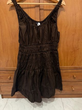 Vestido marrón con detalle fruncido en la cintura y falda. Sin usar, lo compré sin la etiqueta, era el último que quedaba y me esta grande y ya no lo pude devolver. están todas las tallas agotadas - Tirantes finos. - Escote pronunciado. - Diseño con varias capas en la falda.
