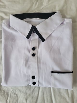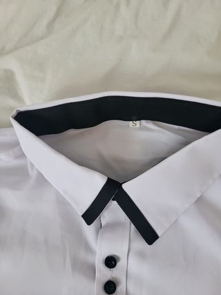Camisa de vestir para caballero con un diseño elegante y moderno. - Cuello camisero con ribete negro. - Puños con ribete negro. - Bolsillo en el pecho con ribete negro. - Botones negros a juego. - Tela muy suave y tacto viscoso - Talla S grande, yo tengo una talla mediana y me está perfecta. Fué un regalo y no puedo cambiar por perdida de tiket.