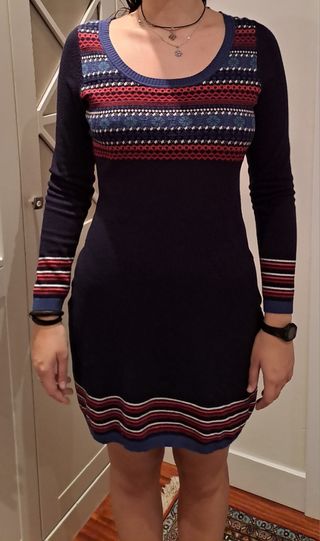 Vestido en punto azul marino. En perfecto estado. Largo un poco por encima de la rodilla. Talla mas grande de lo que pone. Yo diria como una M