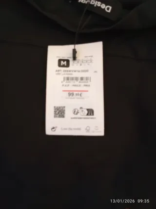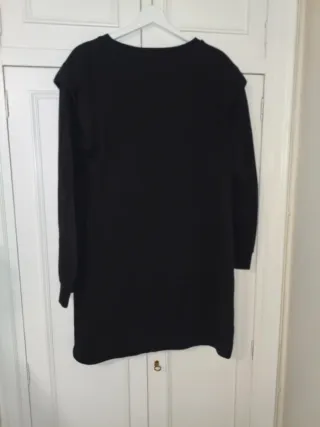 Vestido de tejido tipo sudadera en color negro. Diseño cómodo y versátil. Pone M pero talla muy grande. Equivalente a 42/44 - Manga larga. - corte evasé. Corto por encima de la rodilla - Detalle en los hombros.