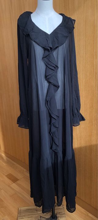 Elegante vestido largo de la marca KappAhl con un diseño de volantes. - Color negro. sin forro - Talla S grande - Mangas largas con volantes en los puños. - Cuello en V con volantes. - Bajo con volantes