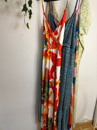 Conjunto de cuatro vestidos largos con estampados variados. Talla XL. - Vestido de tirantes con estampado tropical grande Shein. - Vestido de tirantes con estampado geométrico Cache Cache. - Vestido de tirantes con estampado abstracto Shein. - Vestido de manga abullonada con estampado floral pequeño Primark.