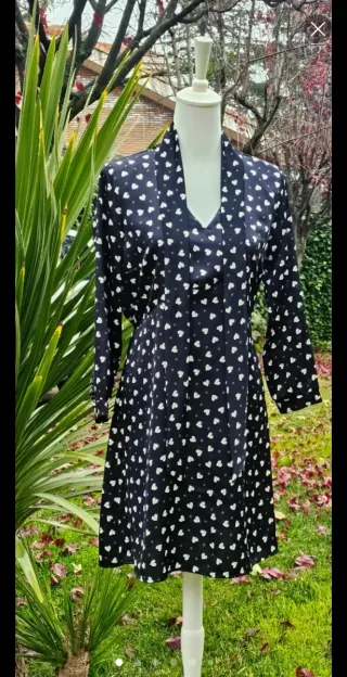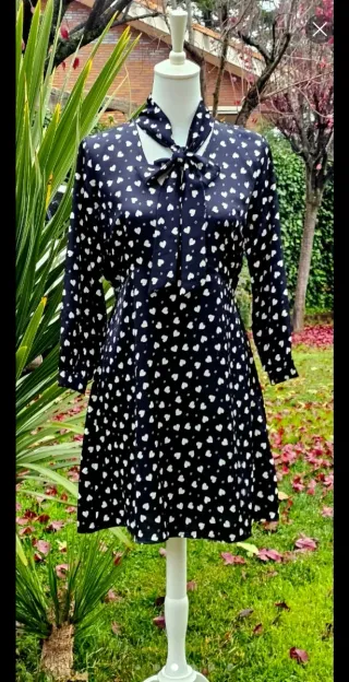 Los vestidos con lazada en el cuello serán las grandes protagonistas de la primavera 2026. Y sí, cuanto más delicados y femeninos, mejor. Como este que además lleva y cuello en V. Con elástico a la cintura por la espalda y por delante corte en V invertida en el pecho que estiliza la figura. Es corto. Manga larga con detalle de volantitos y botón en el puño ( por lo que la manga se puede remangar). Tela satinada negra con pequeños corazones blancos que parecen lunares . Nuevo. Estrenar Medidas en última foto.