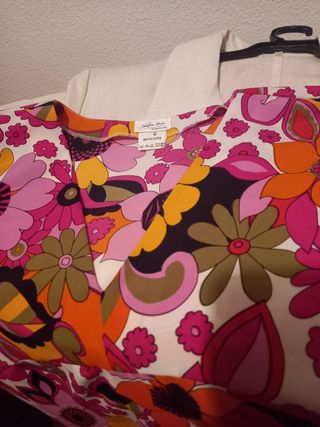 Vestido de Zara con un estampado vibrante y llamativo. es talla M pero es para XL - Diseño con cuello en V. - Mangas cortas. - Estampado de estilo ikat en tonos azules, rosas y naranjas.