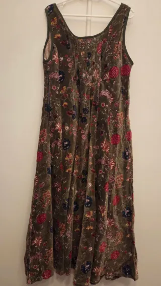 Vestido de terciopelo con un bonito estampado floral. De corte recto/triangulo más bien holgadito, se ajusta al pecho y luego cae. IMPORTANTE: En la etiqueta pone talla S/M pero es más bien L. En cambio NO lo recomiendo si tienes pecho grande, ya que yo tengo una 95C/D de sujetador y me está justo. MEDIDAS: Sisa: 45cm Cintura: 50cm Largo total: 125cm Por lo demás es muy bonito y está en muy buen estado. Diseño sin mangas. Largo hasta el tobillo. Tejido suave.