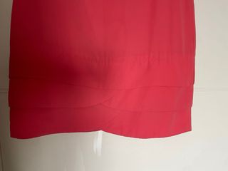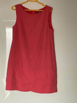 Vestido sin mangas cuello a la caja con detalle de volantes en el bajo color coral. No es oversize, equivaldría a una talla S grande o M