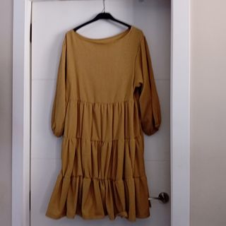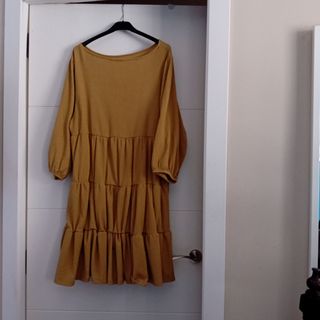 Vestido color caqui, suelto con volantes y mangas anchas que acaban en puño(elástico).El vestido es de tejido un poco elástico por lo que es adaptable a partir de talla L para una talla más más grande. Es muy ligero, cómodo y ponible, yo lo usé una vez pero me queda muy grande