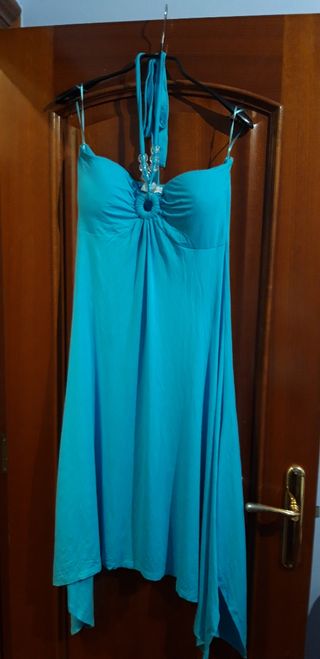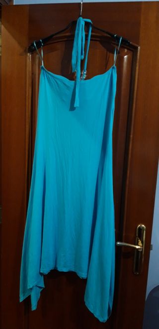 Vestido azul de atar al cuello con abalorios grandes transparentes en el pecho. Talla L (aunque podría adaptarse a la XL porque el tejido es elástico). Usado una sola vez porque me quedaba grande, así que está como nuevo