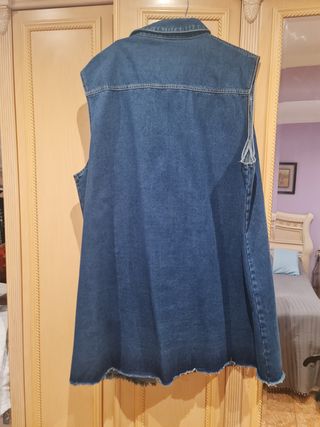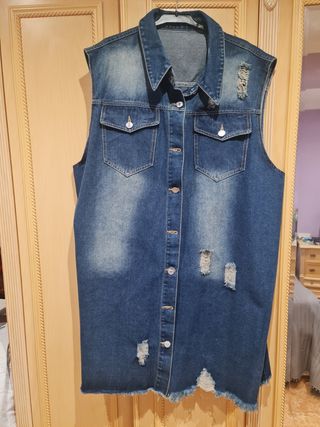 Preciosa vestido vaquero sin mangas, estilo vestido. Tiene un diseño desgastado que le da un toque único. - Es de color azul. - Talla grande. - Diseño deshilachado en el bajo. Medidas: Hombros 49 cms Sisa 66 cms Ancho 69 cms Largo 93 cms