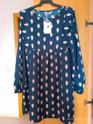 Vestido de manga larga con estampado de huevos. SIN ESTRENAR!! Forrado. Talla S grande. Como 38/40 Cortado por encima de la cintura pero cae suelto. Puños elásticos. No se arruga nada Perfecto para la maleta. Medidas en fotos. Lo envío rápido.