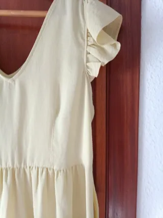 Vestido de la marca C&A en color amarillo. Tiene un diseño con escote en V y mangas cortas con volantes. Pone talla 40 pero es grande para una 46 - Escote en V. - Mangas cortas con volantes. - Cintura elástica.