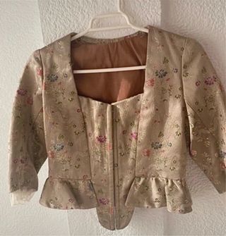 Traje de fallera de época S XVIII, talla 34-36. Diseño elegante y tradicional.Tejido de Vives i Mari Labradora Largo de la falda 110 Zapatos talla 39 - Cuerpo y falda con detalles bordados. - Cuello grande y adornado. - Tejido de alta calidad con estampado floral.