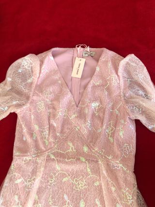 Es una preciosidad de vestido y ponible en toda epoca. Es un vestido corto encima de la rdilla con manga 3/4 y apertura en los hombros. Con muchos detalles: apliques dorados en forma de flor en mangas, bajo y cierre frontal, tiras de encaje beige rosado... y volante abajo. No se arruga Nuevo con etiquetas Ver medidas ultima foto. Pone talla 1 pero da para una 38 perfectamente