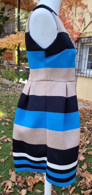 Vestido sin mangas pero abrigado de rayas horizontales blanco beige negro y azulón de tejido tipo neopreno que queda armado y sienta muy bien. Talla M. Puesto en una ocasión en graduación de mi hija