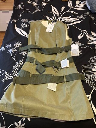 Vestido de Zara en color caqui, con un diseño moderno y detalles de cinturón. - Diseño sin mangas. - Cinturones anchos con hebillas. - talla pequeno no tiene elasticidad