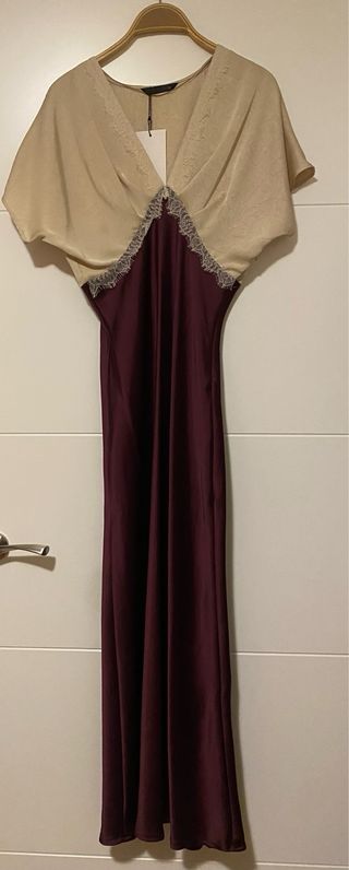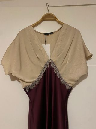 Vestido midi de Zara con un diseño elegante y sofisticado. - Tejido principal en color beige con detalles de encaje. - Falda en color morado con acabado satinado. - Corte midi favorecedor.