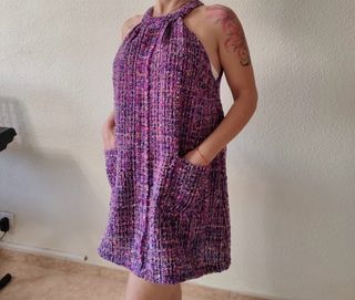 Vestido de Zara con un diseño moderno y cómodo. - Tejido texturizado en tonos morados. - Corte tipo halter. - Bolsillos laterales. - Largo hasta la rodilla.