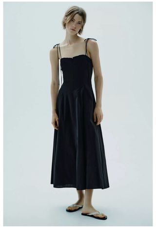 Vestido midi de Zara con escote fruncido y tirantes finos. - Tejido de popelín. - Falda con vuelo. - Cierre con cremallera lateral.