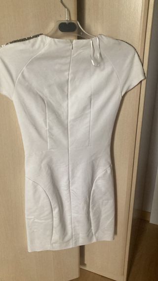 Vestido corto con detalles brillantes en los hombros. - Diseño ajustado. - Cremallera en la espalda. - Mangas cortas.