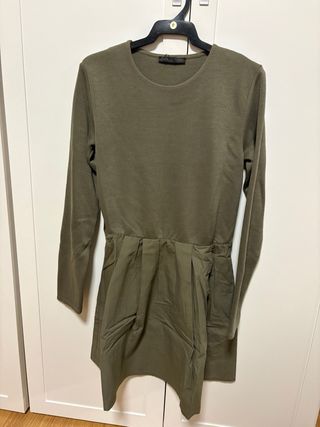 Elegante vestido de punto de Zara. - Diseño de manga larga. - Detalle de bolsillos con botones dorados. - Falda con plisado.