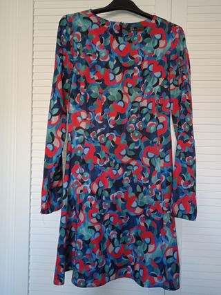 Vestido corto con estampado llamativo, ideal para eventos o fiestas. - Largo: 80; largo falda: 42; contorno cintura elástica: de 66 a 90; contorno pecho: 96; largo manga: 60 - Diseño con cuello con volante y detalle de botones. - Mangas largas con puños fruncidos. - Cintura elástica para un ajuste cómodo. - Falda con vuelo y forro negro.