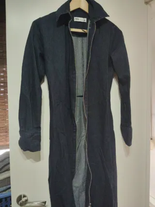 Vestido Zara, color negro, cuello con solapas, manga con puños abotonados, cierre frontal con botones, y aberturas en el bajo frontal y posterior. Tejido elastico. Talla XL. Dos o tres usos. Medidas Hombros 54 cm Sisa a sisa 58 cm Manga 56,5 cm Cintura 42 cm Cadera 52 cm Largo 126 cm
