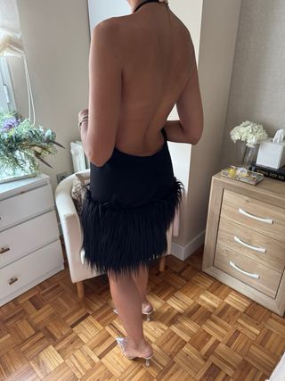 Precioso vestido negro de Zara de edición limitada. Es un diseño elegante y sofisticado, ideal para ocasiones especiales. - Escote halter. - Bajo con detalle de pelo sintético negro. - Corte mini. NUEVO CON ETIQUETAS