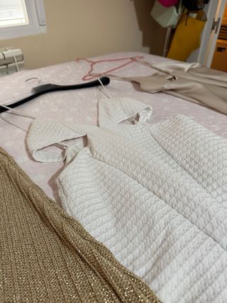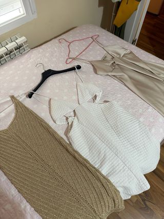 Conjunto de tres vestidos de verano. los 3 son talla S aunque porque son ajustados. - Vestido dorado de punto. - Vestido blanco con textura. - Vestido beige.
