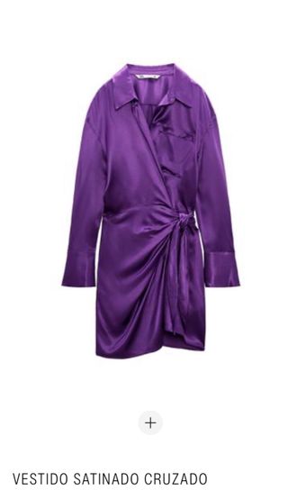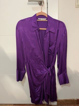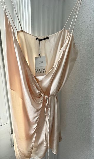 Elegante vestido de Zara con un diseño drapeado y satinado. - Tejido satinado con caída. - Escote cruzado. - Cintura fruncida elástica - Mangas largas Puesto en solo una ocasión, está nuevo, solo tiene unos hijitos pequeños por culpa de una pulsera que salen en la última foto, pero que ni se notan puesto, te tienes que fijar muy bien y con luz para verlos.