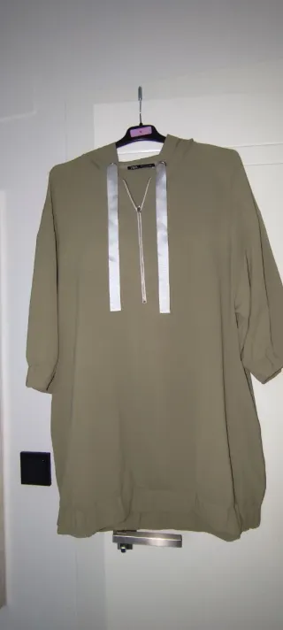 Vestido estilo saco en color verde oliva. Tiene un diseño moderno con cremallera frontal y capucha. - Cremallera plateada. - Cinta plateada decorativa a los lados de la cremallera. - Puños elásticos. - Bajo con cordón ajustable.