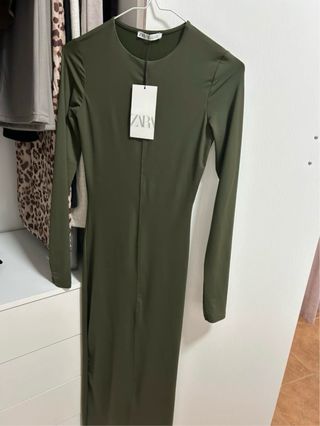 Vestido de Zara de manga larga en color verde militar. Un básico elegante y versátil. - Diseño ajustado. - Costura central delantera. - Cuello redondo.