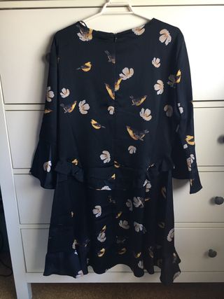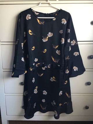 Vestido corto de Zara con un bonito estampado de pájaros y flores. - Diseño con manga larga acampanada. - Volante en la cinturilla y en el bajo. - Cierre de cremallera en la espalda. - Tejido muy suave y elegante. Puesto una sola vez.