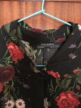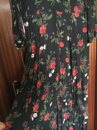 Vestido de Zara con un estampado floral elegante y discreto. El fondo es negro y las flores son rojas y blancas, con detalles verdes y morados. - Bonita caída de la falda. - Manga larga con botón en el puño. - Abotonado de arriba abajo y con pliegue para ocultar botonadura. - Largo hasta los tobillos. - Tejido algodón.