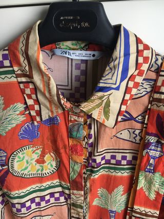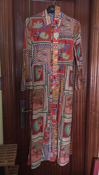 Vestido veraniego de Zara con un original estampado vibrante y llamativo. - Diseño con motivos marinos y geométricos. - Cuello camisero y cierre de botones de arriba abajo. - Manga larga. - Con cinturón a juego.