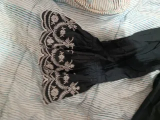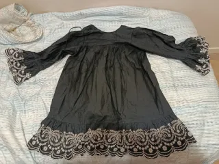Elegante vestido negro con un delicado bordado blanco en las mangas. - Diseño con mangas acampanadas. - Detalle de bordado floral. - Acabado con puntilla en el borde de las mangas.