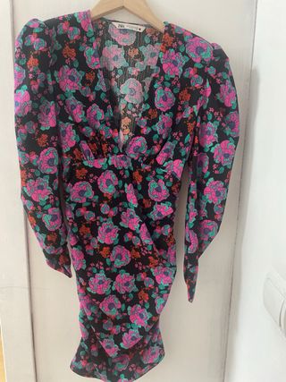 Vestido de Zara con un llamativo estampado floral. - Diseño de manga larga. - Corte midi. - Cuello redondo con abertura en la espalda.
