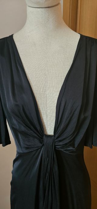 Vestido satinado negro media manga y abertura lateral. Talla M.