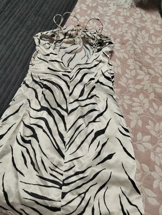 Precioso vestido de cebra en talla S, tejido satinado. ¡Ideal para una ocasión especial! - Escote en V. - Diseño de rayas de cebra en blanco y negro. - Perfecto estado, puesto solo una vez.