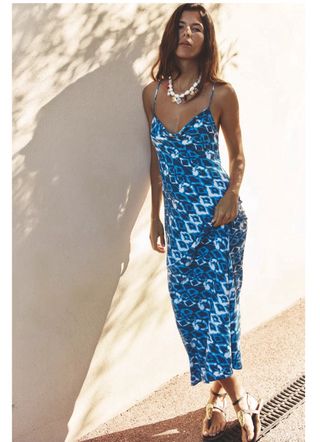 Precioso vestido largo de Zara en azul. Es de seda, ligero y fluido, ideal para verano. - Diseño boho chic con estampado ikat. - Escote pico y tirantes finos cruzados en la espalda. - Corte midi, favorecedor y elegante.
