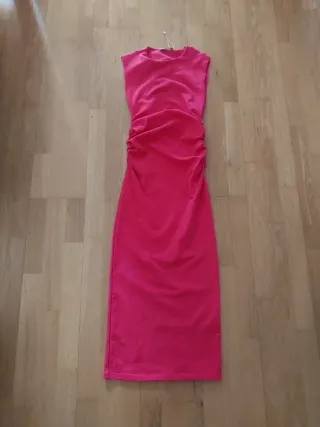 Vestido de Zara con un diseño elegante y moderno. - Color color vino-granate intenso. - Detalle de frunces laterales. - Corte midi. - Cremallera oculta en la espalda.