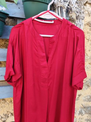 Vestido de color rojo vino, ideal para cualquier ocasión. Su diseño moderno y elegante lo hace una prenda versátil. - Cuello mao. - Manga corta. - Corte recto.