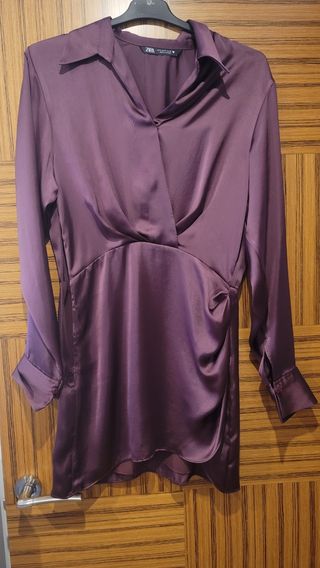 Vestido satinado con cuello de pico y escote cruzado de Zara en color morado berenjena. Cremallera lateral y falda cruzada. Tiene el escote cogido con un punto para que no se abra pero se puede quitar. Talla M. Descuentos por la compra de varios artículos de hasta el 40%! Echa un vistazo a mi perfil 😊
