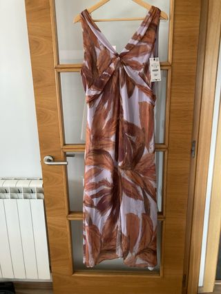 Vestido largo de Zara con un bonito estampado de hojas en tonos marrones y morados. Tiene un diseño cruzado en la parte delantera. - Talla XL - Tejido ligero y fluido.