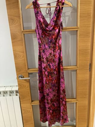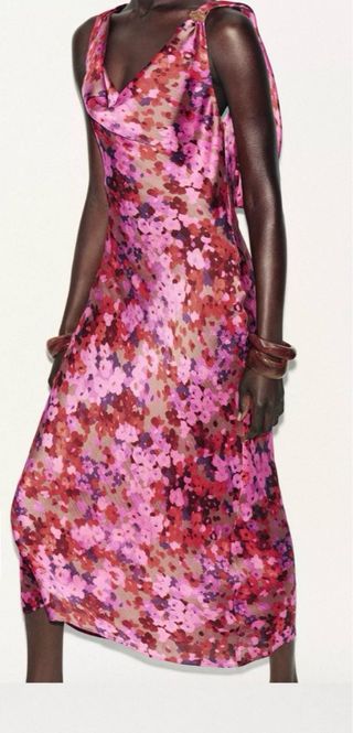 Vestido de Zara con un estampado floral vibrante. - Diseño con cuello drapeado. - Tirantes finos. - Largo midi.