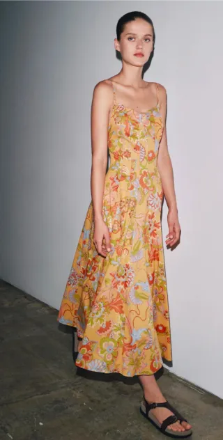 Vestido largo de Zara con un llamativo estampado. - Diseño con tirantes finos. - Detalle fruncido en la cintura. - Bajo con acabado vaporoso.